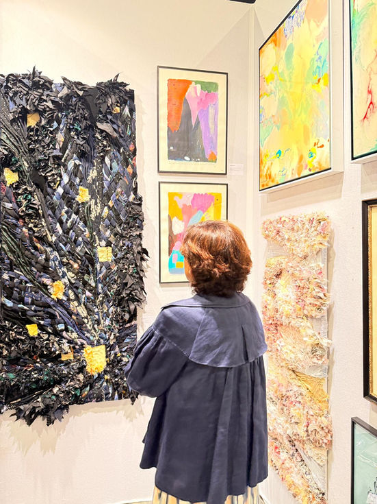 Nika Nuova presented two new artworks at the art3f exhibition in Paris. The exhibition took place at Paris Expo – Porte de Versailles, Pavillon 5.1, 1 Place de la Porte de Versailles. As part of her collaboration with the Espacio Triple gallery, Nika showed her textile paintings Dark City / Shimmering City.